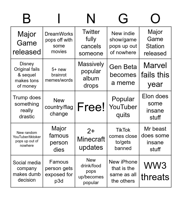 This bingo card has a free space and 24 words: Major famous person dies, Famous person gets exposed for p3d, Massively popular album drops, Social media company makes dumb decision, Major Game Station released, Major Game released, Disney Original fails & sequel makes tons of money, DreamWorks pops off with some movies, Popular YouTuber quits, 2+ Minecraft updates, Gen Beta becomes a meme, Trump does something really drastic, TikTok comes close to/gets banned, Mr beast does some insane stuff, 5+ new brainrot memes/words, New iPhone that is the same as all the others, Elon does some insane stuff, Twitter fully cancels someone, Marvel fails this year, New country/flag change, WW3 threats, New random YouTuber/tiktoker pops up out of nowhere, New indie show/game pops up out of nowhere and New drink/food pops up/becomes popular.