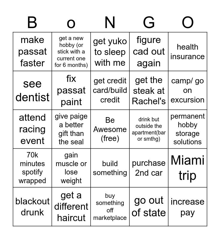 This bingo card has a free space and 24 words: gain muscle or lose weight, get a different haircut, get credit card/build credit, blackout drunk, health insurance, make passat faster, see dentist, get a new hobby (or stick with a current one for 6 months), drink but outside the apartment(bar or smthg), build something, get the steak at Rachel's, attend racing event, purchase 2nd car, Miami trip, fix passat paint, go out of state, permanent hobby storage solutions, get yuko to sleep with me, camp/ go on excursion, give paige a better gift than the seal, increase pay, 70k minutes spotify wrapped, figure cad out again and buy something off marketplace.