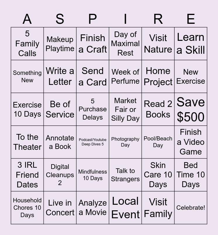 This bingo card has 42 words: Visit Family, Write a Letter, Go on a Trip, Read 2 Books, Finish a Video Game, Annotate a Book, Exercise 10 Days, 2 Meal Preps, Finish a Craft, Save $500, 5 Purchase Delays, Week of Perfume, New Exercise, Visit Nature, Live in Concert, To the Theater, Bed Time 10 Days, Home Project, Celebrate!, Makeup Playtime, Learn a Skill, Mindfulness 10 Days, 3 IRL Friend Dates, 5 Family Calls, 2 New Recipes, Household Chores 10 Days, Send a Card, Practice Anything 10 Days, Digital Cleanups 2, Skin Care 10 Days, Academics Trip, Market Fair or Silly Day, Something New, Pool/Beach Day, Analyze a Movie, Podcast/Youtube Deep Dives 5, Photography Day, Be of Service, Talk to Strangers, Local Event, Day of Maximal Rest and Get Rid of It.