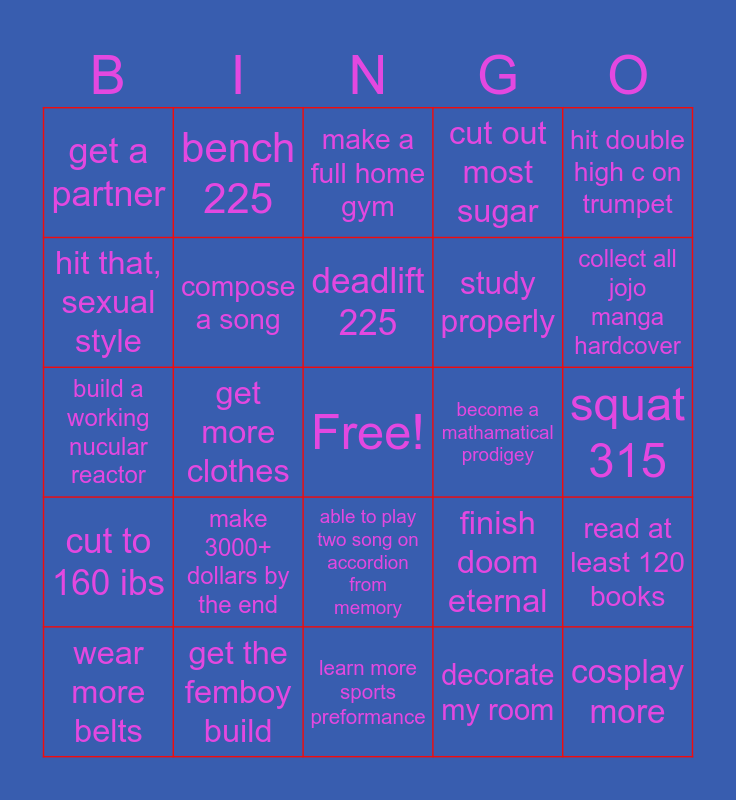 This bingo card has a free space and 24 words: make 3000+ dollars by the end, get the femboy build, deadlift 225, wear more belts, hit double high c on trumpet, get a partner, hit that, sexual style, bench 225, become a mathamatical prodigey, able to play two song on accordion from memory, study properly, build a working nucular reactor, finish doom eternal, read at least 120 books, compose a song, decorate my room, squat 315, make a full home gym, collect all jojo manga hardcover, get more clothes, cosplay more, cut to 160 ibs, cut out most sugar and learn more sports preformance.