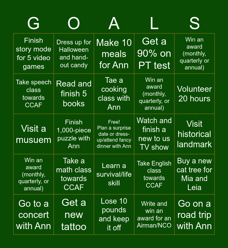 This bingo card has a free space and 24 words: Take a math class towards CCAF, Get a new tattoo, Tae a cooking class with Ann, Go to a concert with Ann, Win an award (monthly, quarterly or annual), Finish story mode for 5 video games, Take speech class towards CCAF, Dress up for Halloween and hand-out candy, Watch and finish a new to us TV show, Learn a survival/life skill, Win an award (monthly, quarterly, or annual), Visit a musuem, Take English class towards CCAF, Buy a new cat tree for Mia and Leia, Read and finish 5 books, Write and win an award for an Airman/NCO, Visit historical landmark, Make 10 meals for Ann, Volunteer 20 hours, Finish 1,000-piece puzzle with Ann, Go on a road trip with Ann, Win an award (monthly, quarterly, or annual), Get a 90% on PT test and Lose 10 pounds and keep it off.