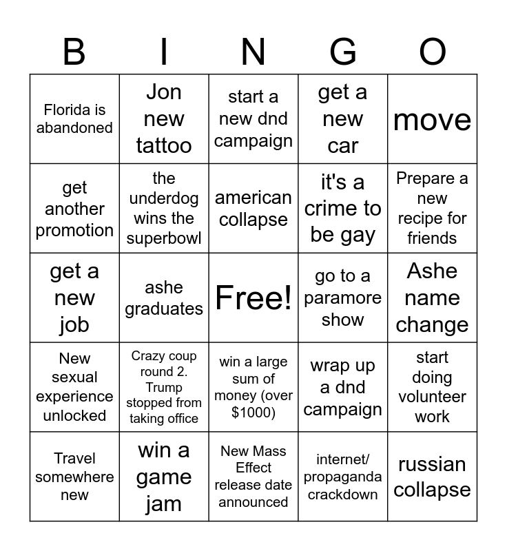 This bingo card has a free space and 24 words: Crazy coup round 2. Trump stopped from taking office, win a game jam, american collapse, Travel somewhere new, move, Florida is abandoned, get another promotion, Jon new tattoo, go to a paramore show, win a large sum of money (over $1000), it's a crime to be gay, get a new job, wrap up a dnd campaign, start doing volunteer work, the underdog wins the superbowl, internet/ propaganda crackdown, Ashe name change, start a new dnd campaign, Prepare a new recipe for friends, ashe graduates, russian collapse, New sexual experience unlocked, get a new car and New Mass Effect release date announced.