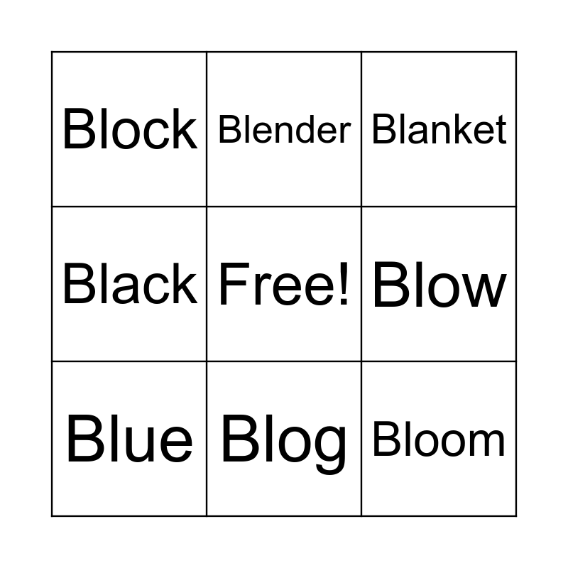 This bingo card has a free space and 9 words: Blue, Blanket, Blender, Black, Block, Blow, Bloom, Blush and Blog.