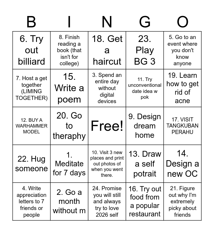 This bingo card has a free space and 24 words: 1. Meditate for 7 days, 2. Go a month without m, 3. Spend an entire day without digital devices, 4. Write appreciation letters to 7 friends or people, 5. Go to an event where you don't know anyone, 6. Try out billiard, 7. Host a get together (LIMING TOGETHER), 8. Finish reading a book (that isn't for college), 9. Design dream home, 10. Visit 3 new places and print out photos of when you went there., 11. Try unconventional date idea w pok, 12. BUY A WARHAMMER MODEL, 13. Draw a self potrait, 14. Design a new OC, 15. Write a poem, 16. Try out food from a popular restaurant, 17. VISIT TANGKUBAN PERAHU, 18. Get a haircut, 19. Learn how to get rid of acne, 20. Go to theraphy, 21. Figure out why I'm extremely picky about friends, 22. Hug someone, 23. Play BG 3 and 24. Promise you will still and always try to love 2026 self.
