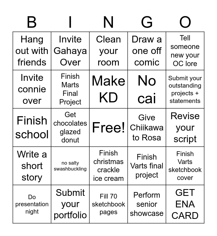 This bingo card has a free space and 24 words: no salty swashbuckling, Submit your portfolio, Make KD, Do presentation night, Tell someone new your OC lore, Hang out with friends, Invite connie over, Invite Gahaya Over, Give Chiikawa to Rosa, Finish christmas crackle ice cream, No cai, Finish school, Finish Varts final project, Finish Varts sketchbook cover, Finish Marts Final Project, Perform senior showcase, Revise your script, Clean your room, Submit your outstanding projects + statements, Get chocolates glazed donut, GET ENA CARD, Write a short story, Draw a one off comic and Fill 70 sketchbook pages.