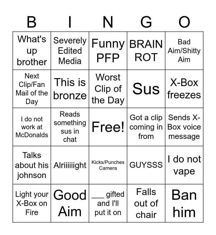 This bingo card has a free space and 24 words: Alriiiiiight, Good Aim, Worst Clip of the Day, Light your X-Box on Fire, Bad Aim/Shitty Aim, What's up brother, Next Clip/Fan Mail of the Day, Severely Edited Media, Got a clip coming in from, Kicks/Punches Camera, Sus, I do not work at McDonalds, GUYSSS, I do not vape, This is bronze, Falls out of chair, Sends X-Box voice message, Funny PFP, X-Box freezes, Reads something sus in chat, Ban him, Talks about his johnson, BRAIN ROT and ___ gifted and I'll put it on.
