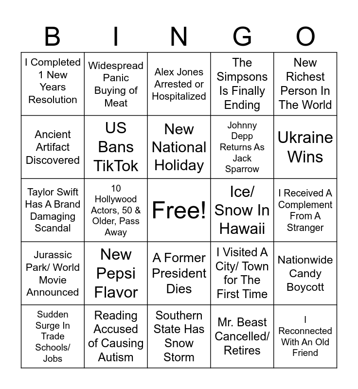 This bingo card has a free space and 24 words: New Pepsi Flavor, Reading Accused of Causing Autism, New National Holiday, Sudden Surge In Trade Schools/ Jobs, New Richest Person In The World, I Completed 1 New Years Resolution, Ancient Artifact Discovered, Widespread Panic Buying of Meat, Ice/ Snow In Hawaii, A Former President Dies, Johnny Depp Returns As Jack Sparrow, Taylor Swift Has A Brand Damaging Scandal, I Visited A City/ Town for The First Time, Nationwide Candy Boycott, US Bans TikTok, Mr. Beast Cancelled/ Retires, I Received A Complement From A Stranger, Alex Jones Arrested or Hospitalized, Ukraine Wins, 10 Hollywood Actors, 50 & Older, Pass Away, I Reconnected With An Old Friend, Jurassic Park/ World Movie Announced, The Simpsons Is Finally Ending and Southern State Has Snow Storm.