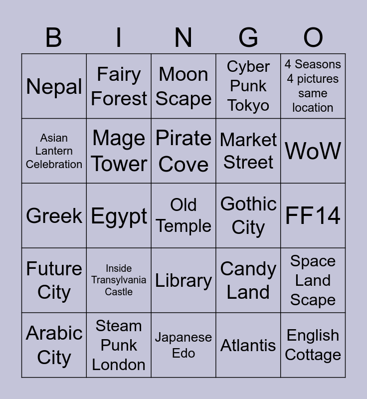 This bingo card has a free space and 24 words: Inside Transylvania Castle, Steam Punk London, Pirate Cove, Arabic City, 4 Seasons 4 pictures same location, Nepal, Asian Lantern Celebration, Fairy Forest, Gothic City, Library, Market Street, Greek, Candy Land, Space Land Scape, Mage Tower, Atlantis, FF14, Moon Scape, WoW, Egypt, English Cottage, Future City, Cyber Punk Tokyo and Japanese Edo.