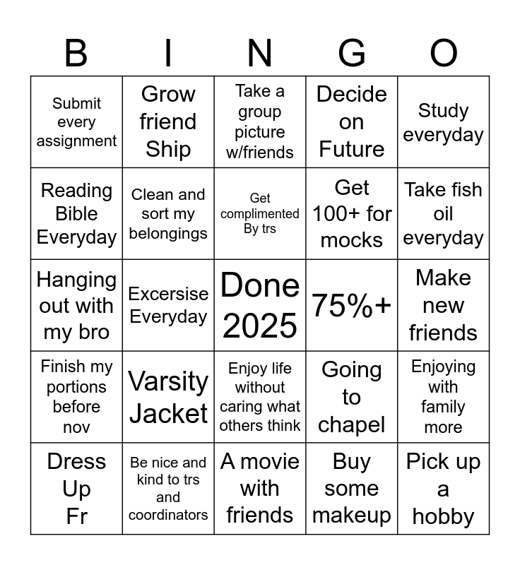 This bingo card has a free space and 24 words: Varsity Jacket, Be nice and kind to trs and coordinators, Get complimented By trs, Dress Up Fr, Study everyday, Submit every assignment, Reading Bible Everyday, Grow friend Ship, 75%+, Enjoy life without caring what others think, Get 100+ for mocks, Hanging out with my bro, Going to chapel, Enjoying with family more, Clean and sort my belongings, Buy some makeup, Make new friends, Take a group picture w/friends, Take fish oil everyday, Excersise Everyday, Pick up a hobby, Finish my portions before nov, Decide on Future and A movie with friends.