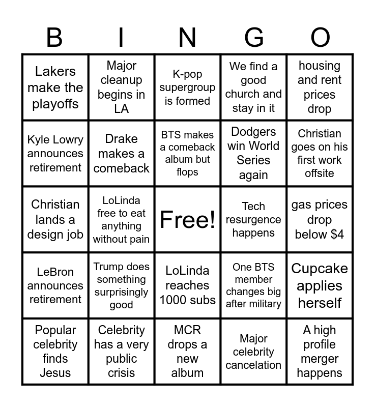 This bingo card has a free space and 24 words: Trump does something surprisingly good, Celebrity has a very public crisis, BTS makes a comeback album but flops, Popular celebrity finds Jesus, housing and rent prices drop, Lakers make the playoffs, Kyle Lowry announces retirement, Major cleanup begins in LA, Tech resurgence happens, LoLinda reaches 1000 subs, Dodgers win World Series again, Christian lands a design job, One BTS member changes big after military, Cupcake applies herself, Drake makes a comeback, Major celebrity cancelation, gas prices drop below $4, K-pop supergroup is formed, Christian goes on his first work offsite, LoLinda free to eat anything without pain, A high profile merger happens, LeBron announces retirement, We find a good church and stay in it and MCR drops a new album.