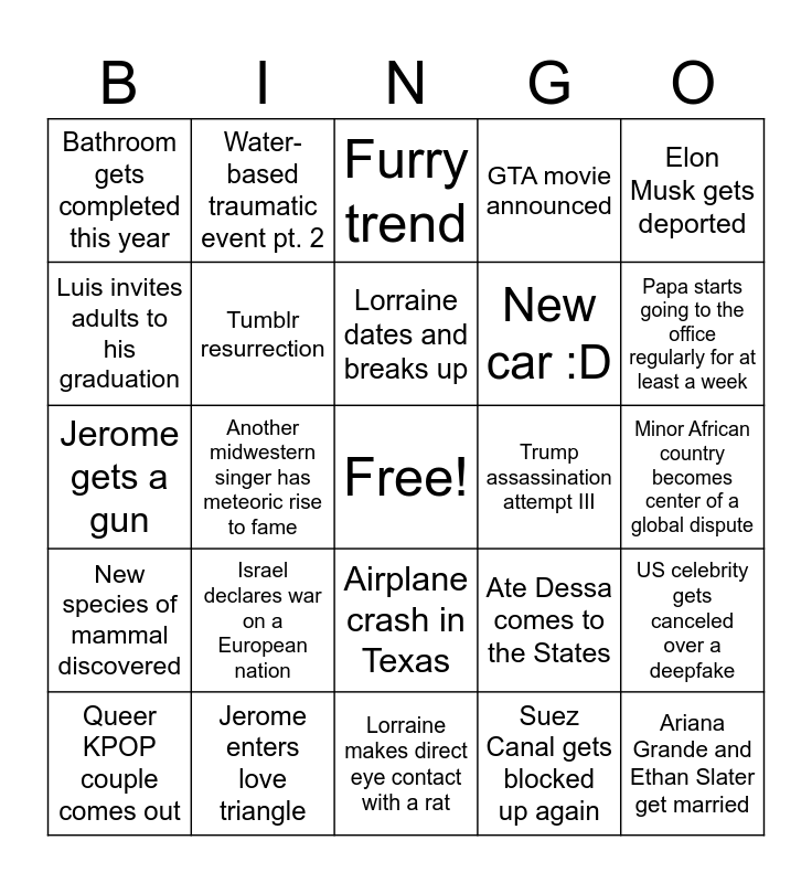 This bingo card has a free space and 24 words: Israel declares war on a European nation, Jerome enters love triangle, Lorraine dates and breaks up, Queer KPOP couple comes out, Elon Musk gets deported, Bathroom gets completed this year, Luis invites adults to his graduation, Water-based traumatic event pt. 2, Trump assassination attempt III, Airplane crash in Texas, New car :D, Jerome gets a gun, Ate Dessa comes to the States, US celebrity gets canceled over a deepfake, Tumblr resurrection, Suez Canal gets blocked up again, Minor African country becomes center of a global dispute, Furry trend, Papa starts going to the office regularly for at least a week, Another midwestern singer has meteoric rise to fame, Ariana Grande and Ethan Slater get married, New species of mammal discovered, GTA movie announced and Lorraine makes direct eye contact with a rat.