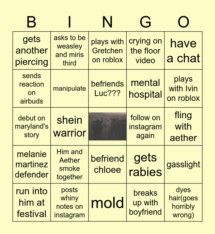 This bingo card has a free space and 24 words: Him and Aether smoke together, posts whiny notes on instagram, befriends Luc???, run into him at festival, have a chat, gets another piercing, sends reaction on airbuds, asks to be weasley and miris third, follow on instagram again, befriend chloee, mental hospital, debut on maryland's story, gets rabies, gasslight, manipulate, breaks up with boyfriend, fling with aether, plays with Gretchen on roblox, plays with Ivin on roblox, shein warrior, dyes hair(goes horribly wrong), melanie martinez defender, crying on the floor video and mold.