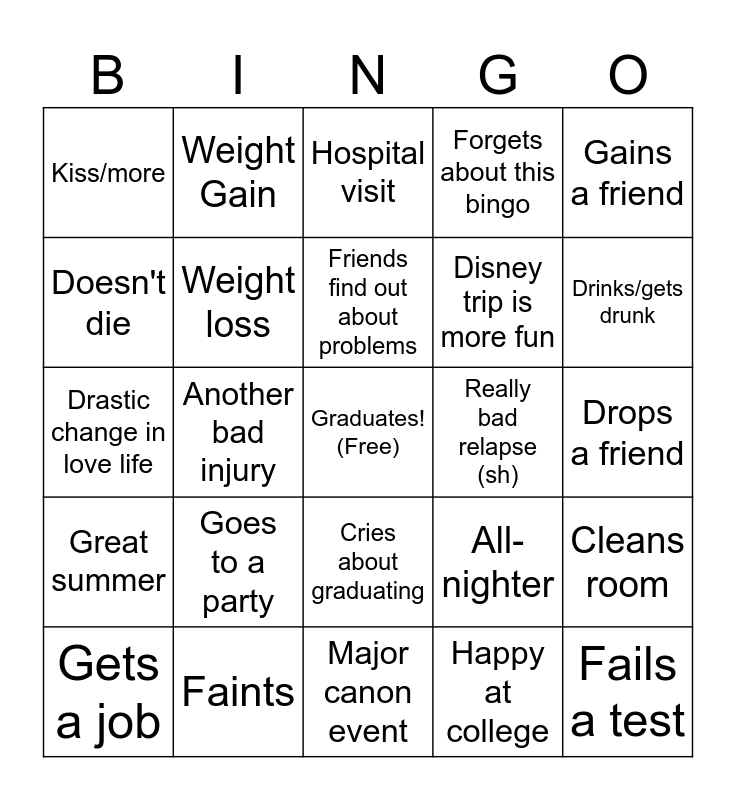 This bingo card has a free space and 24 words: Goes to a party, Faints, Friends find out about problems, Gets a job, Gains a friend, Kiss/more, Doesn't die, Weight Gain, Really bad relapse (sh), Cries about graduating, Disney trip is more fun, Drastic change in love life, All-nighter, Cleans room, Weight loss, Happy at college, Drops a friend, Hospital visit, Drinks/gets drunk, Another bad injury, Fails a test, Great summer, Forgets about this bingo and Major canon event.