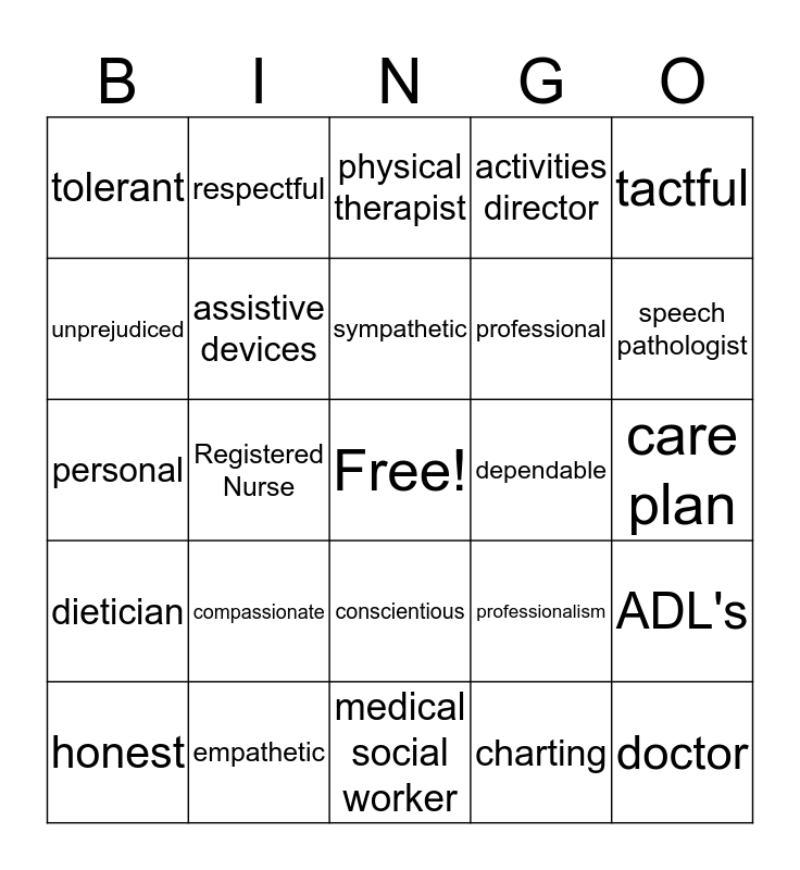 This bingo card has a free space and 24 words: compassionate, empathetic, sympathetic, honest, tactful, tolerant, unprejudiced, respectful, dependable, conscientious, professional, personal, professionalism, ADL's, assistive devices, charting, care plan, physical therapist, speech pathologist, Registered Nurse, doctor, dietician, activities director and medical social worker.