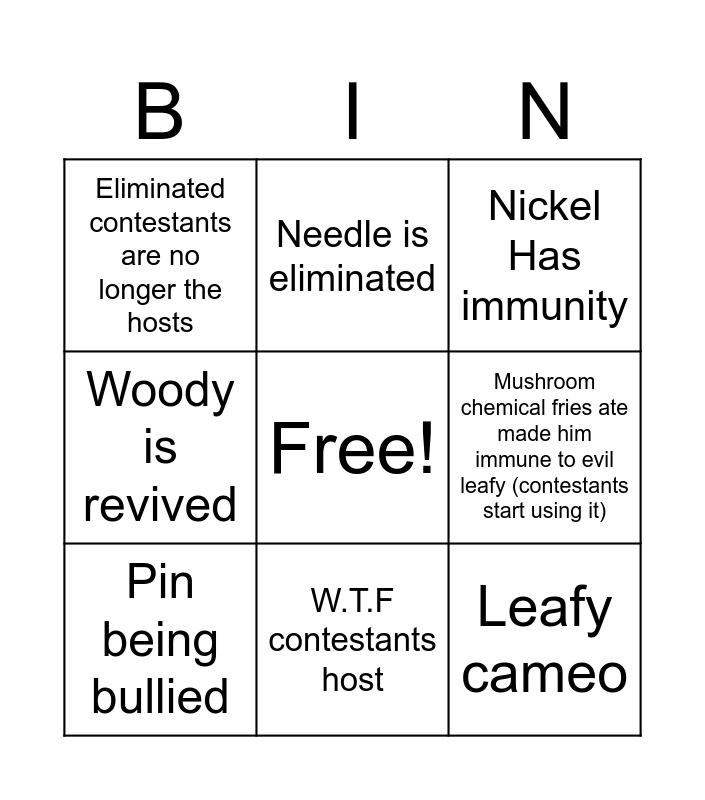 This bingo card has a free space and 8 words: Mushroom chemical fries ate made him immune to evil leafy (contestants start using it), Nickel Has immunity, Needle is eliminated, Pin being bullied, Eliminated contestants are no longer the hosts, Leafy cameo, Woody is revived and W.T.F contestants host.