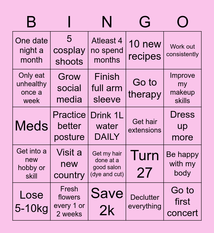 This bingo card has 25 words: Visit a new country, Save 2k, Finish full arm sleeve, Lose 5-10kg, Work out consistently, One date night a month, Only eat unhealthy once a week, 5 cosplay shoots, Get hair extensions, Get my hair done at a good salon (dye and cut), Go to therapy, Meds, Turn 27, Be happy with my body, Grow social media, Go to first concert, Dress up more, Atleast 4 no spend months, Improve my makeup skills, Practice better posture, Drink 1L water DAILY, Fresh flowers every 1 or 2 weeks, Get into a new hobby or skill, 10 new recipes and Declutter everything.
