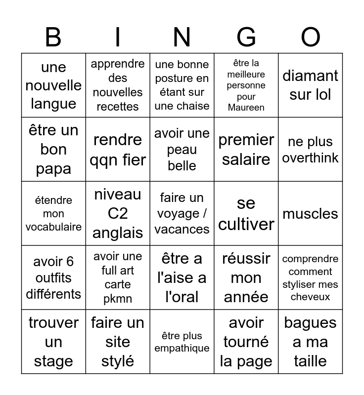 This bingo card has 25 words: avoir une full art carte pkmn, être plus empathique, avoir une peau belle, trouver un stage, diamant sur lol, une nouvelle langue, être un bon papa, apprendre des nouvelles recettes, se cultiver, être a l'aise a l'oral, premier salaire, étendre mon vocabulaire, réussir mon année, comprendre comment styliser mes cheveux, rendre qqn fier, bagues a ma taille, muscles, une bonne posture en étant sur une chaise, ne plus overthink, niveau C2 anglais, faire un voyage / vacances, faire un site stylé, avoir 6 outfits différents, être la meilleure personne pour Maureen and avoir tourné la page.