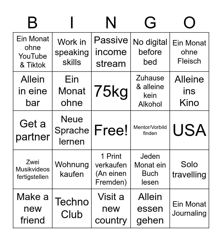 This bingo card has a free space and 24 words: Wohnung kaufen, Techno Club, 75kg, Make a new friend, Ein Monat ohne Fleisch, Ein Monat ohne YouTube & Tiktok, Allein in eine bar, Work in speaking skills, Mentor/Vorbild finden, 1 Print verkaufen (An einen Fremden), Zuhause & alleine kein Alkohol, Get a partner, Jeden Monat ein Buch lesen, Solo travelling, Ein Monat ohne, Allein essen gehen, USA, Passive income stream, Alleine ins Kino, Neue Sprache lernen, Ein Monat Journaling, Zwei Musikvideos fertigstellen, No digital before bed and Visit a new country.