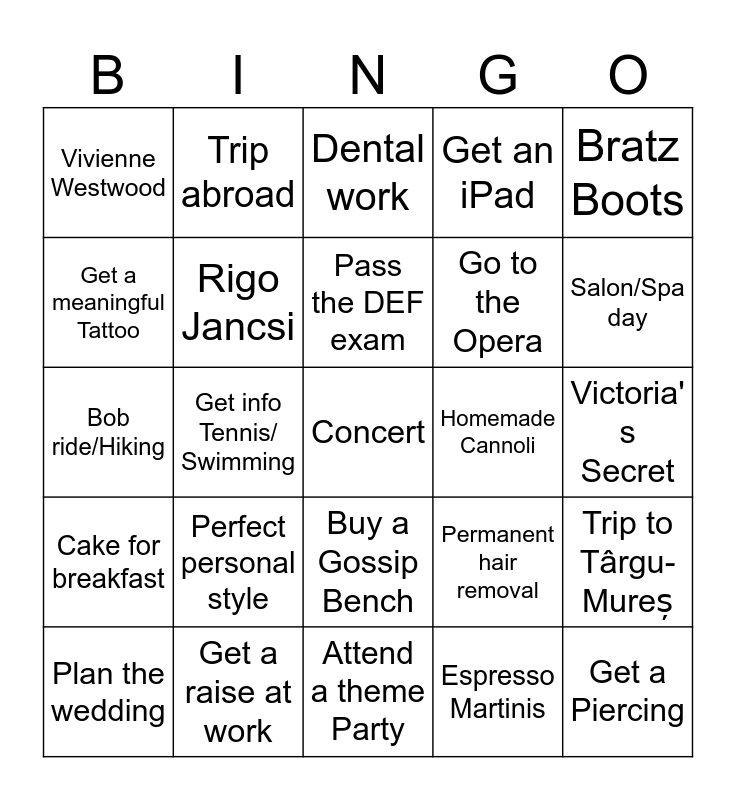 This bingo card has a free space and 24 words: Perfect personal style, Get a raise at work, Pass the DEF exam, Plan the wedding, Bratz Boots, Vivienne Westwood, Get a meaningful Tattoo, Trip abroad, Homemade Cannoli, Buy a Gossip Bench, Go to the Opera, Bob ride/Hiking, Permanent hair removal, Trip to Târgu-Mureș, Rigo Jancsi, Espresso Martinis, Victoria' s Secret, Dental work, Salon/Spa day, Get info Tennis/ Swimming, Get a Piercing, Cake for breakfast, Get an iPad and Attend a theme Party.