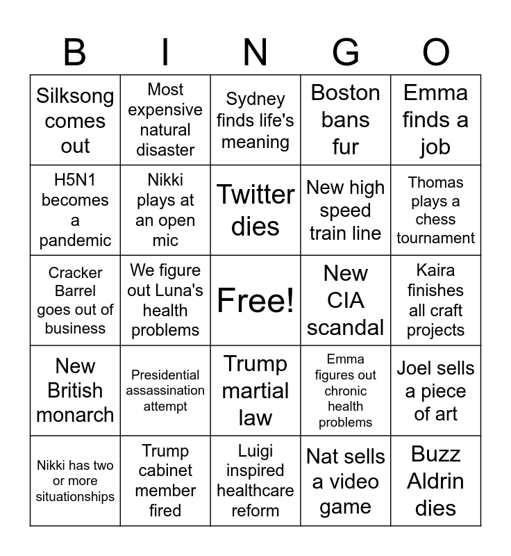 This bingo card has a free space and 24 words: Presidential assassination attempt, Trump cabinet member fired, Twitter dies, Nikki has two or more situationships, Emma finds a job, Silksong comes out, H5N1 becomes a pandemic, Most expensive natural disaster, New CIA scandal, Trump martial law, New high speed train line, Cracker Barrel goes out of business, Emma figures out chronic health problems, Joel sells a piece of art, Nikki plays at an open mic, Nat sells a video game, Kaira finishes all craft projects, Sydney finds life's meaning, Thomas plays a chess tournament, We figure out Luna's health problems, Buzz Aldrin dies, New British monarch, Boston bans fur and Luigi inspired healthcare reform.