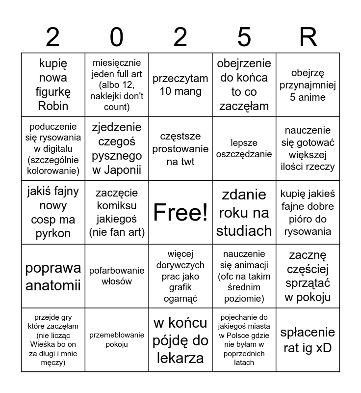 This bingo card has a free space and 24 words: pofarbowanie włosów, przemeblowanie pokoju, częstsze prostowanie na twt, przejdę gry które zaczęłam (nie licząc Wieśka bo on za długi i mnie męczy), obejrzę przynajmniej 5 anime, kupię nowa figurkę Robin, poduczenie się rysowania w digitalu (szczególnie kolorowanie), miesięcznie jeden full art (albo 12, naklejki don't count), zdanie roku na studiach, więcej dorywczych prac jako grafik ogarnąć, lepsze oszczędzanie, jakiś fajny nowy cosp ma pyrkon, nauczenie się animacji (ofc na takim średnim poziomie), zacznę częściej sprzątać w pokoju, zjedzenie czegoś pysznego w Japonii, pojechanie do jakiegoś miasta w Polsce gdzie nie byłam w poprzednich latach, kupię jakieś fajne dobre pióro do rysowania, przeczytam 10 mang, nauczenie się gotować większej ilości rzeczy, zaczęcie komiksu jakiegoś (nie fan art), spłacenie rat ig xD, poprawa anatomii, obejrzenie do końca to co zaczęłam and w końcu pójdę do lekarza.