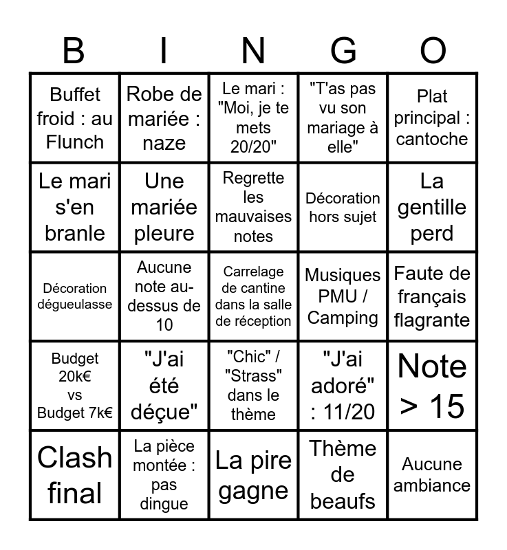 This bingo card has a free space and 26 words: "Chic" / "Strass" dans le thème, Thème de beaufs, Regrette les mauvaises notes, La pièce montée : pas dingue, Plat principal : cantoche, Buffet froid : au Flunch, Le mari s'en branle, Robe de mariée : naze, Faute de français flagrante, "J'ai adoré" : 11/20, Décoration hors sujet, Décoration dégueulasse, Note > 15, Clash final, Aucune note au-dessus de 10, 7/20, "T'as pas vu son mariage à elle", Budget 20k€ vs Budget 7k€, Le mari : "Moi, je te mets 20/20", Aucune ambiance, La gentille perd, La pire gagne, Musiques PMU / Camping, "J'ai été déçue", Une mariée pleure and "Il n'y a pas d'émotion".