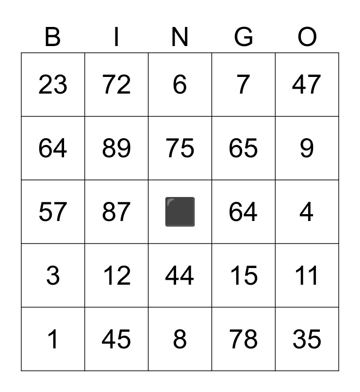 This bingo card has a free space and 24 words: 12, 45, 75, 1, 47, 23, 64, 72, 64, 44, 65, 57, 15, 11, 89, 78, 4, 6, 9, 87, 35, 3, 7 and 8.