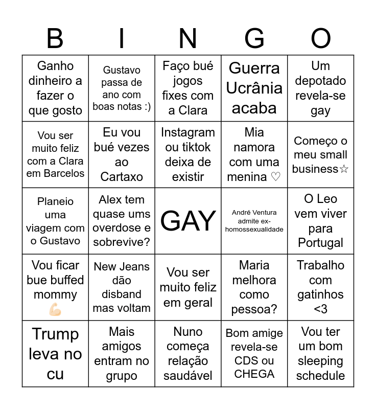 This bingo card has a free space and 24 words: New Jeans dão disband mas voltam, Mais amigos entram no grupo, Instagram ou tiktok deixa de existir, Trump leva no cu, Um depotado revela-se gay, Ganho dinheiro a fazer o que gosto, Vou ser muito feliz com a Clara em Barcelos, Gustavo passa de ano com boas notas :), André Ventura admite ex-homossexualidade, Vou ser muito feliz em geral, Mia namora com uma menina ♡, Planeio uma viagem com o Gustavo, Maria melhora como pessoa?, Trabalho com gatinhos <3, Eu vou bué vezes ao Cartaxo, Bom amige revela-se CDS ou CHEGA, O Leo vem viver para Portugal, Faço bué jogos fixes com a Clara, Começo o meu small business☆, Alex tem quase ums overdose e sobrevive?, Vou ter um bom sleeping schedule, Vou ficar bue buffed mommy 💪🏻, Guerra Ucrânia acaba and Nuno começa relação saudável.