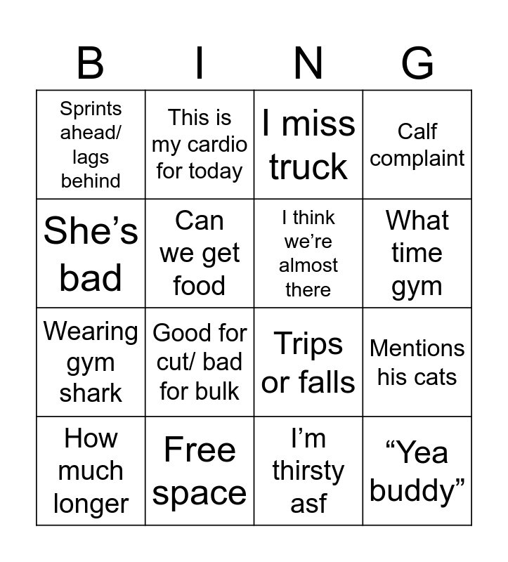 This bingo card has 16 words: Free space, Mentions his cats, I miss truck, Sprints ahead/ lags behind, Wearing gym shark, This is my cardio for today, Trips or falls, I’m thirsty asf, She’s bad, Can we get food, How much longer, Calf complaint, Good for cut/ bad for bulk, What time gym, I think we’re almost there and “Yea buddy”.