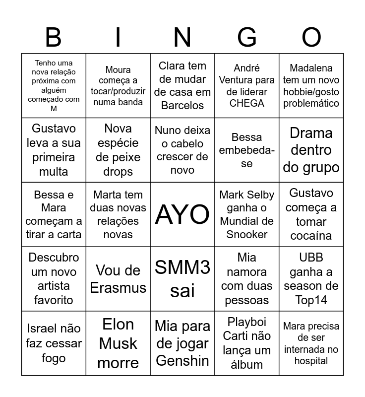This bingo card has a free space and 24 words: Vou de Erasmus, Elon Musk morre, Nuno deixa o cabelo crescer de novo, Israel não faz cessar fogo, Madalena tem um novo hobbie/gosto problemático, Tenho uma nova relação próxima com alguém começado com M, Gustavo leva a sua primeira multa, Moura começa a tocar/produzir numa banda, Mark Selby ganha o Mundial de Snooker, SMM3 sai, Bessa embebeda-se, Bessa e Mara começam a tirar a carta, Mia namora com duas pessoas, UBB ganha a season de Top14, Nova espécie de peixe drops, Playboi Carti não lança um álbum, Gustavo começa a tomar cocaína, Clara tem de mudar de casa em Barcelos, Drama dentro do grupo, Marta tem duas novas relações novas, Mara precisa de ser internada no hospital, Descubro um novo artista favorito, André Ventura para de liderar CHEGA and Mia para de jogar Genshin.
