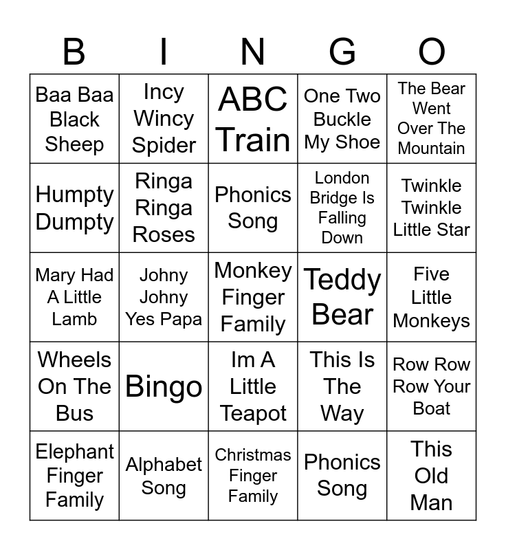 This bingo card has 36 words: Five Little Ducks, If You’re Happy and You Know It, Rain Rain Go Away, Ringa Ringa Roses, This Is The Way, Wheels On The Bus, Phonics Song, Old MacDonald, The Bear Went Over The Mountain, Ten Little Indians, Johny Johny Yes Papa, One Two Buckle My Shoe, Free!, Teddy Bear, Twinkle Twinkle Little Star, Baa Baa Black Sheep, This Old Man, Bingo, Monkey Finger Family, ABC Train, Five Little Monkeys, Row Row Row Your Boat, Alphabet Song, Elephant Finger Family, Christmas Finger Family, Incy Wincy Spider, Mary Had A Little Lamb, Five Little Speckled Frogs, London Bridge Is Falling Down, Humpty Dumpty, Hickory Dickory Dock, Ten Little Indians, Phonics Song, Im A Little Teapot, 12345 Once I Caught A Fish Alive and Twinkle Twinkle Little Star.