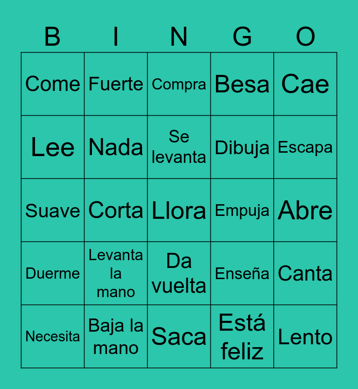This bingo card has 70 words: Abraza, Abre, Agarra, Baila, Baja la mano, Bebe, Besa, Busca, Cae, Camina, Canta, Cierra, Come, Compra, Corre, Corta, Da vuelta, Dibuja, Dice, Duerme, Empuja, Enseña, Escapa, Escribe, Escucha, Está cansad@, Está enferm@, Está enojad@, Está feliz, Está triste, Fuerte, Grande, Grita, Habla, Hace, Hay, Huele (bien, mal), Juega, Le da, Lee, Lento, Levanta la mano, Llora, Me gusta, Mira, Nada, Necesita, Patina, Pega (suave/fuerte), Pequeño, Pone, Quiere, Rompe, Rápido, Saca, Salta, Se levanta, Se ríe, Se sienta, Sonríe, Suave, Tiene, Tiene calor, Tiene hambre, Tira (una pelota), Toca, Toma, Trabaja, Va and Ve.