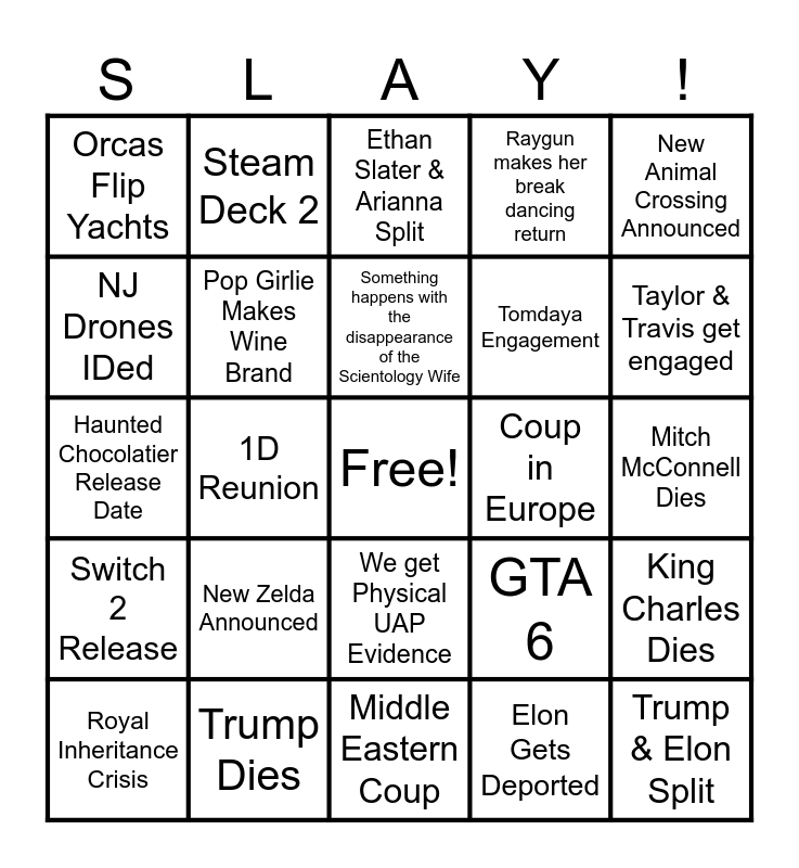 This bingo card has a free space and 30 words: Trump Dies, Harry Styles Releases Music again, 1D Reunion, Luigi Found Not Guilty, Orcas Flip Yachts, Ethan Slater & Arianna Split, Pop Girlie Makes Wine Brand, We get Physical UAP Evidence, Coup in Europe, Middle Eastern Coup, Mitch McConnell Dies, Trump & Elon Split, Elon Gets Deported, Putin Dies, Taylor & Travis get engaged, Mets World Series, GTA 6, Switch 2 Release, New Zelda Announced, New Animal Crossing Announced, Haunted Chocolatier Release Date, Royal Divorce, Steam Deck 2, Tomdaya Engagement, NJ Drones IDed, Raygun makes her break dancing return, King Charles Dies, Royal Inheritance Crisis, Something happens with the disappearance of the Scientology Wife and A slayer personal conspiracy theory turns out to be true.