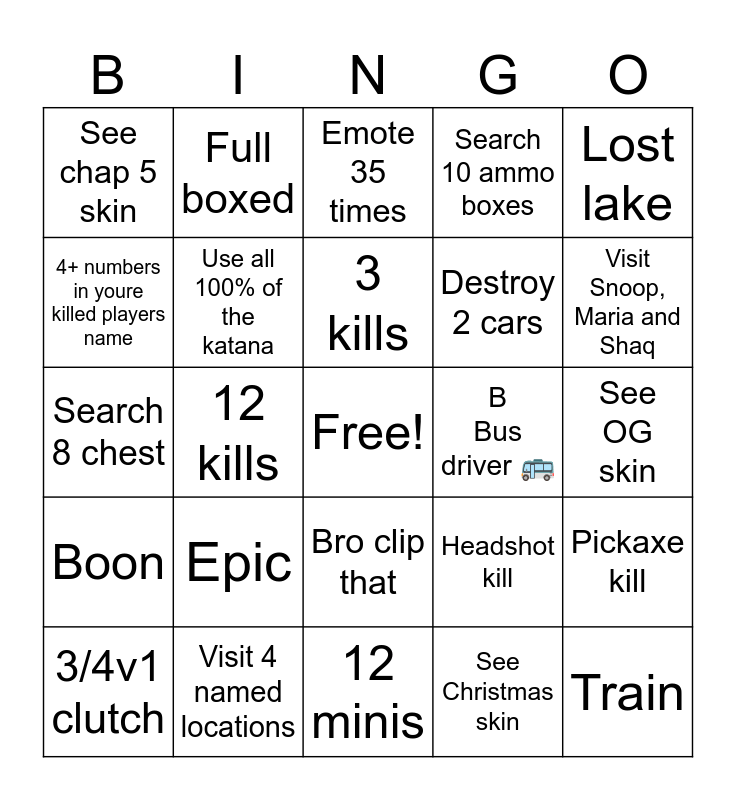 This bingo card has a free space and 24 words: Epic, Visit 4 named locations, 3 kills, 3/4v1 clutch, Lost lake, See chap 5 skin, 4+ numbers in youre killed players name, Full boxed, B Bus driver 🚌, Bro clip that, Destroy 2 cars, Search 8 chest, Headshot kill, Pickaxe kill, Use all 100% of the katana, See Christmas skin, See OG skin, Emote 35 times, Visit Snoop, Maria and Shaq, 12 kills, Train, Boon, Search 10 ammo boxes and 12 minis.