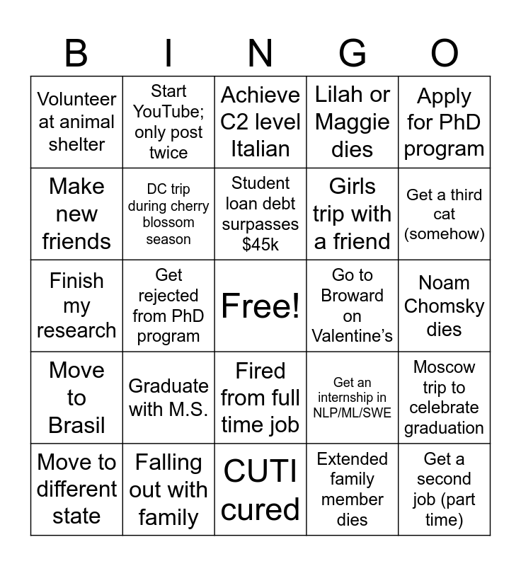This bingo card has a free space and 24 words: Graduate with M.S., Falling out with family, Student loan debt surpasses $45k, Move to different state, Apply for PhD program, Volunteer at animal shelter, Make new friends, Start YouTube; only post twice, Go to Broward on Valentine’s, Fired from full time job, Girls trip with a friend, Finish my research, Get an internship in NLP/ML/SWE, Moscow trip to celebrate graduation, DC trip during cherry blossom season, Extended family member dies, Noam Chomsky dies, Achieve C2 level Italian, Get a third cat (somehow), Get rejected from PhD program, Get a second job (part time), Move to Brasil, Lilah or Maggie dies and CUTI cured.