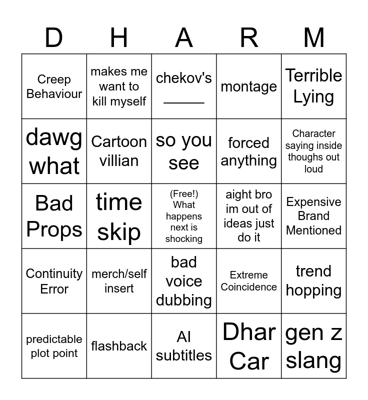 This bingo card has a free space and 24 words: merch/self insert, flashback, so you see, predictable plot point, Terrible Lying, Creep Behaviour, dawg what, makes me want to kill myself, aight bro im out of ideas just do it, bad voice dubbing, forced anything, Bad Props, Extreme Coincidence, trend hopping, Cartoon villian, Dhar Car, Expensive Brand Mentioned, chekov's _____, Character saying inside thoughs out loud, time skip, gen z slang, Continuity Error, montage and AI subtitles.