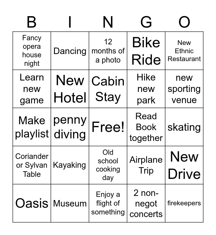 This bingo card has a free space and 24 words: Kayaking, Museum, Cabin Stay, Oasis, New Ethnic Restaurant, Fancy opera house night, Learn new game, Dancing, Read Book together, Old school cooking day, Hike new park, Make playlist, Airplane Trip, New Drive, New Hotel, 2 non-negot concerts, skating, 12 months of a photo, new sporting venue, penny diving, firekeepers, Coriander or Sylvan Table, Bike Ride and Enjoy a flight of something.
