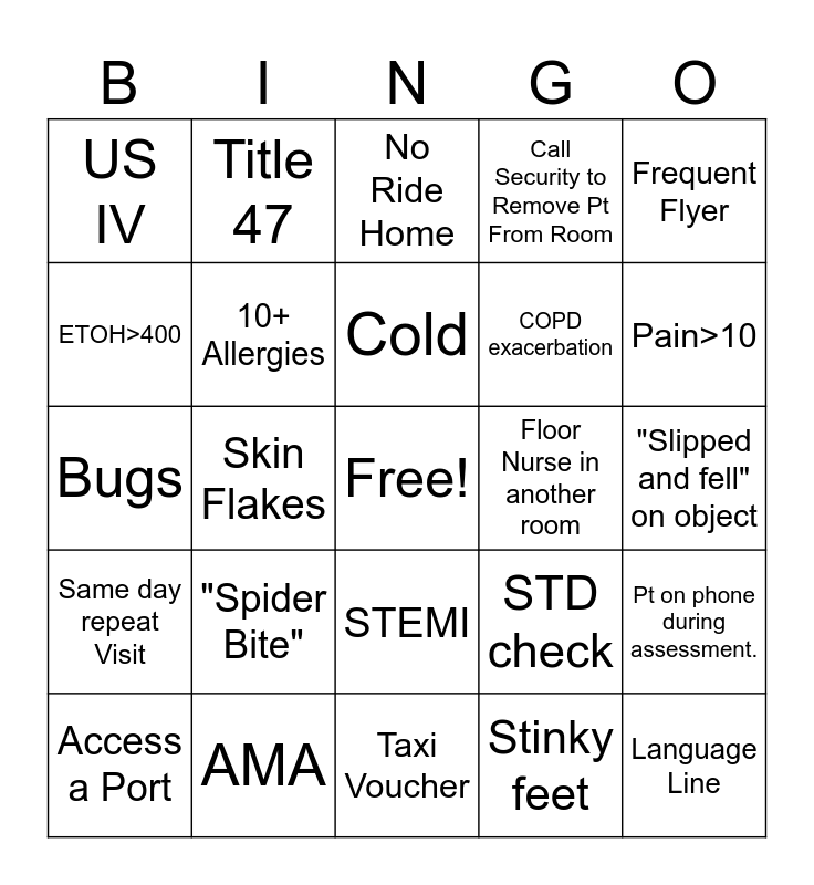 This bingo card has a free space and 24 words: "Spider Bite", AMA, Cold, Access a Port, Frequent Flyer, US IV, ETOH>400, Title 47, Floor Nurse in another room, STEMI, COPD exacerbation, Bugs, STD check, Pt on phone during assessment., 10+ Allergies, Stinky feet, "Slipped and fell" on object, No Ride Home, Pain>10, Skin Flakes, Language Line, Same day repeat Visit, Call Security to Remove Pt From Room and Taxi Voucher.