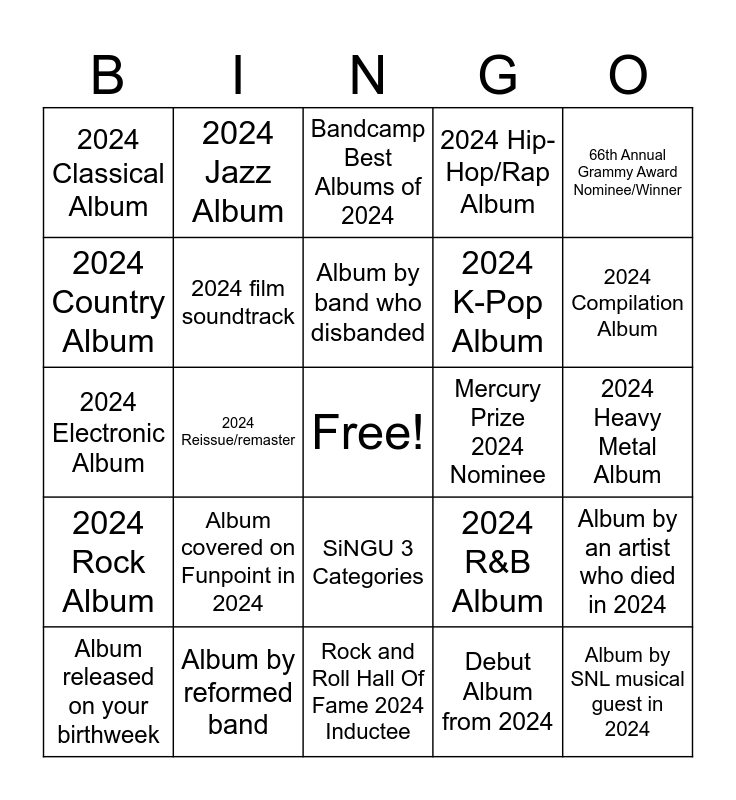This bingo card has a free space and 26 words: SiNGU 3 Categories, Debut Album from 2024, Album by band who disbanded, Album by reformed band, 66th Annual Grammy Award Nominee/Winner, 2024 Classical Album, 2024 Country Album, 2024 Jazz Album, 2024 Heavy Metal Album, 2024 R&B Album, 2024 K-Pop Album, 2024 Electronic Album, Album by an artist who died in 2024, Album released on your birthweek, 2024 Reissue/remaster, 2024 Live Album, 2024 Hip-Hop/Rap Album, 2024 Rock Album, Bandcamp Best Albums of 2024, Album by SNL musical guest in 2024, 2024 Compilation Album, Rock and Roll Hall Of Fame 2024 Inductee, Mercury Prize 2024 Nominee, Album covered on Funpoint in 2024, 2024 film soundtrack and Free Space.