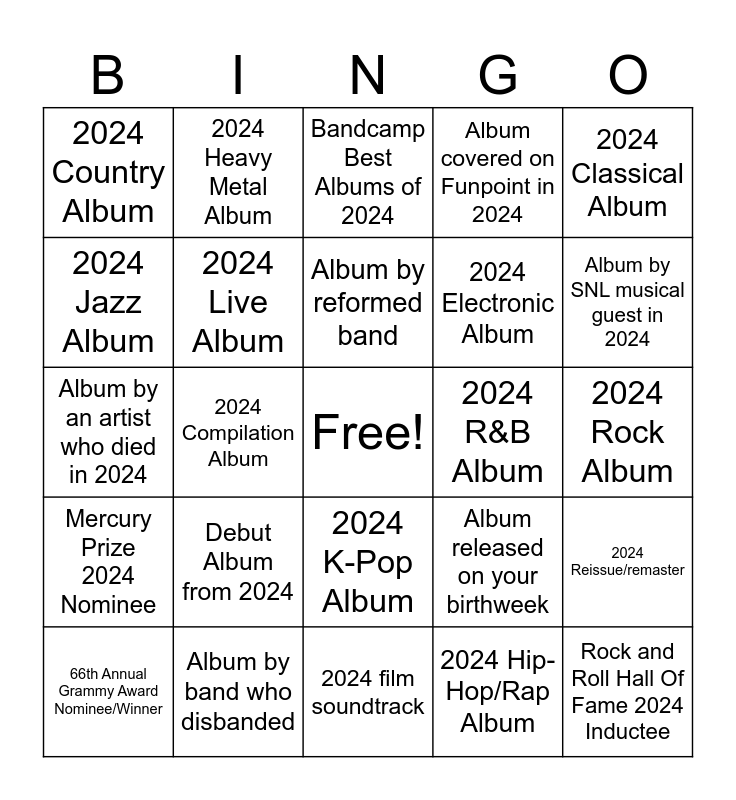 This bingo card has a free space and 24 words: Debut Album from 2024, Album by band who disbanded, Album by reformed band, 66th Annual Grammy Award Nominee/Winner, 2024 Classical Album, 2024 Country Album, 2024 Jazz Album, 2024 Heavy Metal Album, 2024 R&B Album, 2024 K-Pop Album, 2024 Electronic Album, Album by an artist who died in 2024, Album released on your birthweek, 2024 Reissue/remaster, 2024 Live Album, 2024 Hip-Hop/Rap Album, 2024 Rock Album, Bandcamp Best Albums of 2024, Album by SNL musical guest in 2024, 2024 Compilation Album, Rock and Roll Hall Of Fame 2024 Inductee, Mercury Prize 2024 Nominee, Album covered on Funpoint in 2024 and 2024 film soundtrack.