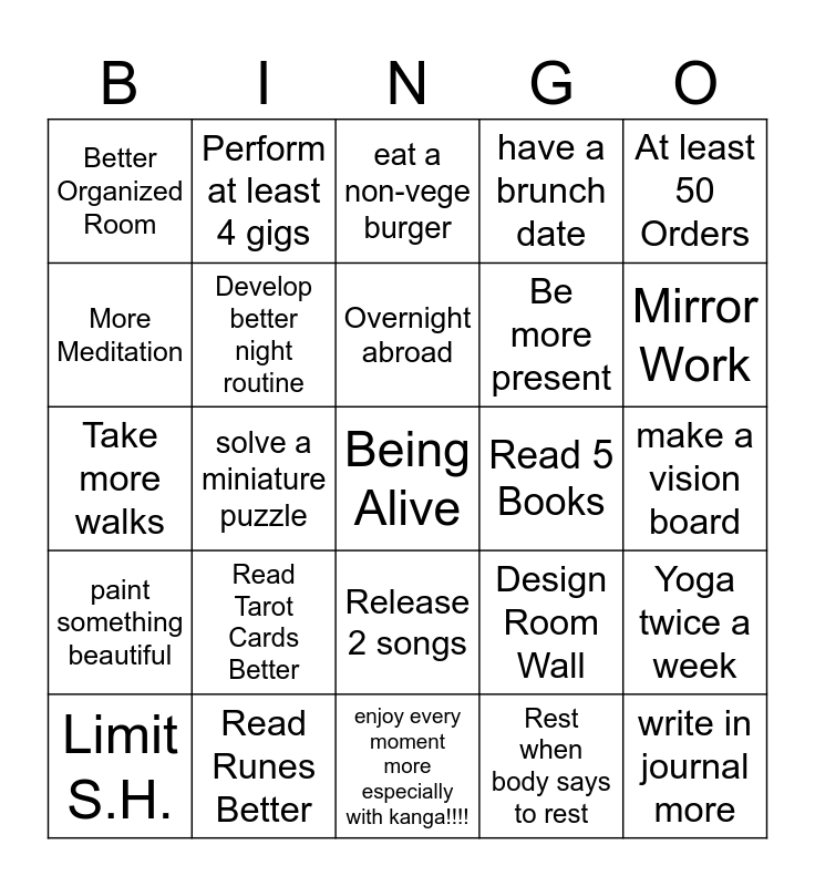 This bingo card has a free space and 24 words: Read Tarot Cards Better, Read Runes Better, Overnight abroad, Limit S.H., At least 50 Orders, Better Organized Room, More Meditation, Perform at least 4 gigs, Read 5 Books, Release 2 songs, Be more present, Take more walks, Design Room Wall, Yoga twice a week, Develop better night routine, Rest when body says to rest, make a vision board, eat a non-vege burger, Mirror Work, solve a miniature puzzle, write in journal more, paint something beautiful, have a brunch date and enjoy every moment more especially with kanga!!!!.