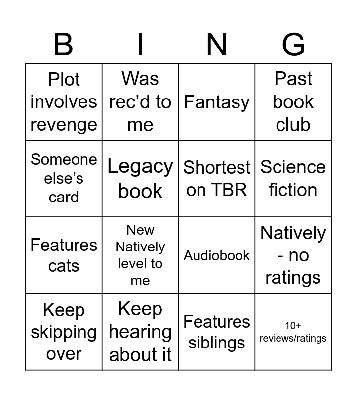 This bingo card has 16 words: Keep hearing about it, Natively - no ratings, Fantasy, Plot involves revenge, Features cats, Was rec’d to me, Audiobook, Features siblings, Someone else’s card, Legacy book, Keep skipping over, Past book club, New Natively level to me, Science fiction, Shortest on TBR and 10+ reviews/ratings.