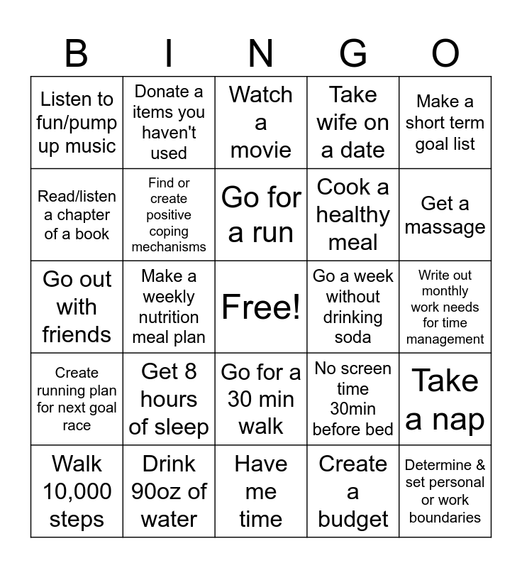 This bingo card has a free space and 24 words: Get 8 hours of sleep, Drink 90oz of water, Go for a run, Walk 10,000 steps, Make a short term goal list, Listen to fun/pump up music, Read/listen a chapter of a book, Donate a items you haven't used, Go a week without drinking soda, Go for a 30 min walk, Cook a healthy meal, Go out with friends, No screen time 30min before bed, Take a nap, Find or create positive coping mechanisms, Create a budget, Write out monthly work needs for time management, Watch a movie, Get a massage, Make a weekly nutrition meal plan, Determine & set personal or work boundaries, Create running plan for next goal race, Take wife on a date and Have me time.