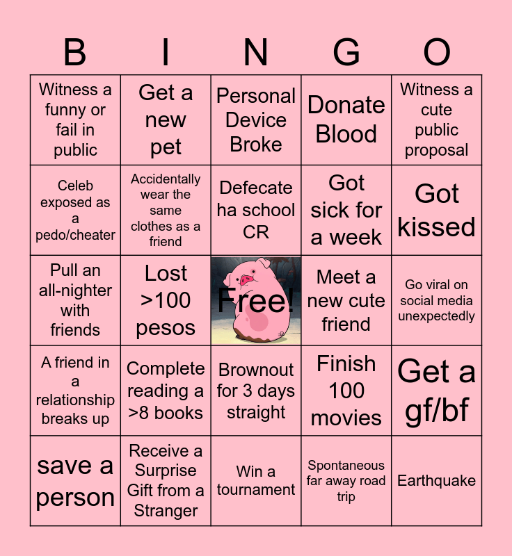 This bingo card has a free space and 24 words: Complete reading a >8 books, Receive a Surprise Gift from a Stranger, Defecate ha school CR, save a person, Witness a cute public proposal, Witness a funny or fail in public, Celeb exposed as a pedo/cheater, Get a new pet, Meet a new cute friend, Brownout for 3 days straight, Got sick for a week, Pull an all-nighter with friends, Finish 100 movies, Get a gf/bf, Accidentally wear the same clothes as a friend, Spontaneous far away road trip, Go viral on social media unexpectedly, Personal Device Broke, Got kissed, Lost >100 pesos, Earthquake, A friend in a relationship breaks up, Donate Blood and Win a tournament.