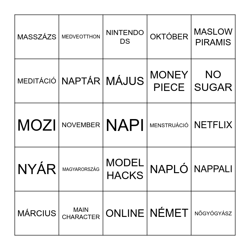 This bingo card has a free space and 24 words: MAGYARORSZÁG, MAIN CHARACTER, MÁJUS, MÁRCIUS, MASLOW PIRAMIS, MASSZÁZS, MEDITÁCIÓ, MEDVEOTTHON, MENSTRUÁCIÓ, MODEL HACKS, MONEY PIECE, MOZI, NAPLÓ, NAPPALI, NAPTÁR, NÉMET, NETFLIX, NINTENDO DS, NO SUGAR, NOVEMBER, NŐGYÓGYÁSZ, NYÁR, OKTÓBER and ONLINE.