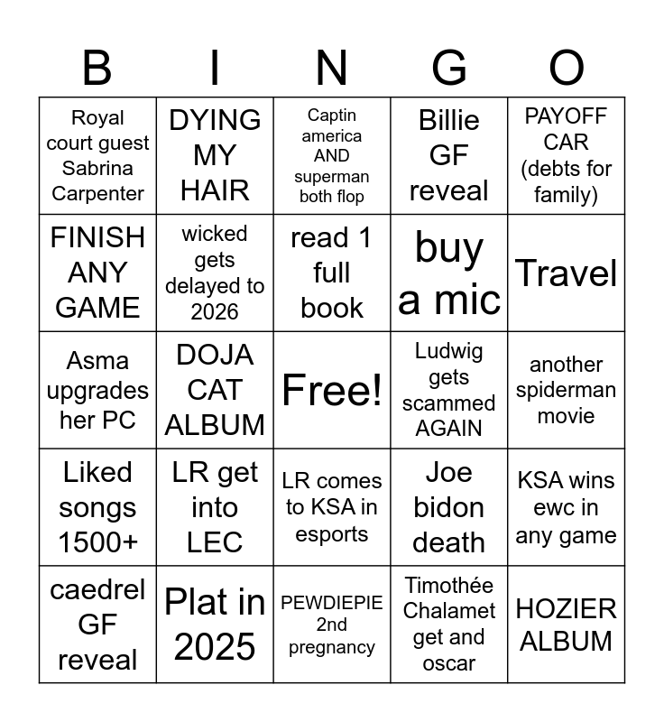 This bingo card has a free space and 24 words: LR get into LEC, Plat in 2025, read 1 full book, caedrel GF reveal, PAYOFF CAR (debts for family), Royal court guest Sabrina Carpenter, FINISH ANY GAME, DYING MY HAIR, Ludwig gets scammed AGAIN, LR comes to KSA in esports, buy a mic, Asma upgrades her PC, Joe bidon death, KSA wins ewc in any game, wicked gets delayed to 2026, Timothée Chalamet get and oscar, another spiderman movie, Captin america AND superman both flop, Travel, DOJA CAT ALBUM, HOZIER ALBUM, Liked songs 1500+, Billie GF reveal and PEWDIEPIE 2nd pregnancy.