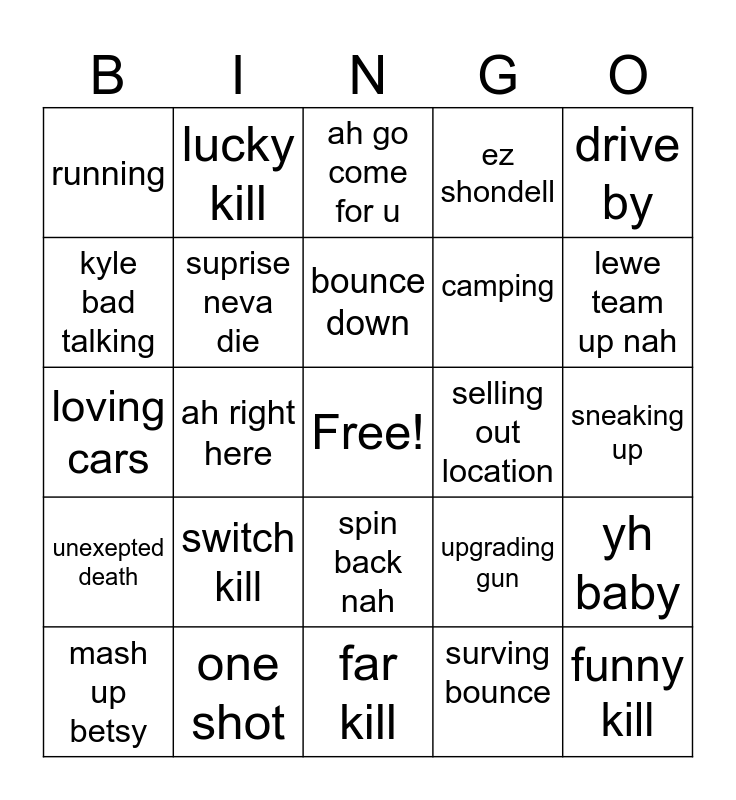 This bingo card has a free space and 24 words: switch kill, one shot, bounce down, mash up betsy, drive by, running, kyle bad talking, lucky kill, selling out location, spin back nah, camping, loving cars, upgrading gun, yh baby, suprise neva die, surving bounce, sneaking up, ah go come for u, lewe team up nah, ah right here, funny kill, unexepted death, ez shondell and far kill.