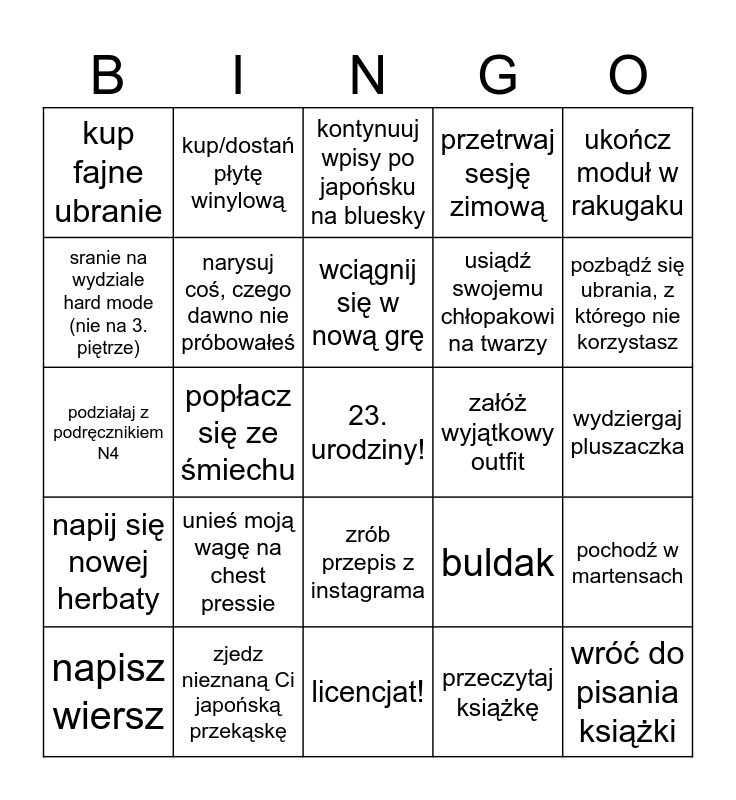 This bingo card has a free space and 24 words: napisz wiersz, unie艣 moj膮 wag臋 na chest pressie, wci膮gnij si臋 w now膮 gr臋, przeczytaj ksi膮偶k臋, uko艅cz modu艂 w rakugaku, kup fajne ubranie, kup/dosta艅 p艂yt臋 winylow膮, kontynuuj wpisy po japo艅sku na bluesky, za艂贸偶 wyj膮tkowy outfit, wydziergaj pluszaczka, podzia艂aj z podr臋cznikiem N4, narysuj co艣, czego dawno nie pr贸bowa艂e艣, buldak, pochod藕 w martensach, sranie na wydziale hard mode (nie na 3. pi臋trze), zjedz nieznan膮 Ci japo艅sk膮 przek膮sk臋, licencjat!, przetrwaj sesj臋 zimow膮, pozb膮d藕 si臋 ubrania, z kt贸rego nie korzystasz, napij si臋 nowej herbaty, pop艂acz si臋 ze 艣miechu, zr贸b przepis z instagrama, usi膮d藕 swojemu ch艂opakowi na twarzy and wr贸膰 do pisania ksi膮偶ki.