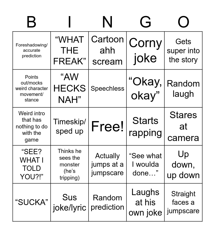 This bingo card has a free space and 24 words: Thinks he sees the monster (he’s tripping), Sus joke/lyric, Speechless, “SUCKA”, Gets super into the story, Foreshadowing/ accurate prediction, Points out/mocks weird character movement/ stance, “WHAT THE FREAK”, Starts rapping, Actually jumps at a jumpscare, “Okay, okay”, Weird intro that has nothing to do with the game, “See what I woulda done…”, Up down, up down, “AW HECKS NAH”, Laughs at his own joke, Stares at camera, Cartoon ahh scream, Random laugh, Timeskip/ sped up, Straight faces a jumpscare, “SEE? WHAT I TOLD YOU?!”, Corny joke and Random prediction.