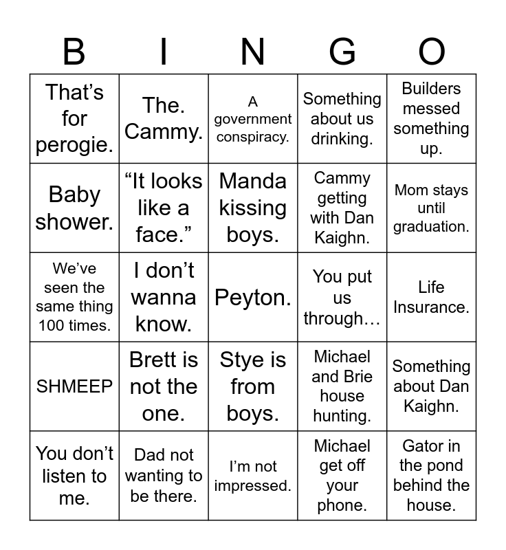 This bingo card has a free space and 24 words: Brett is not the one., Dad not wanting to be there., Manda kissing boys., You don’t listen to me., Builders messed something up., That’s for perogie., Baby shower., The. Cammy., You put us through…, Stye is from boys., Cammy getting with Dan Kaighn., We’ve seen the same thing 100 times., Michael and Brie house hunting., Something about Dan Kaighn., “It looks like a face.”, Michael get off your phone., Life Insurance., A government conspiracy., Mom stays until graduation., I don’t wanna know., Gator in the pond behind the house., SHMEEP, Something about us drinking. and I’m not impressed..